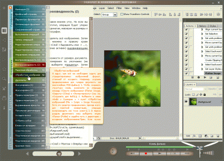 читься работе в Фотошоп можно по-разному. Одни предпочитают учебное видео, другие ну никак не могут без старой доброй книги. Видео быстрее ответит на вопрос "как", текст доходчивее объяснит "зачем". "А что если объединить эти подходы?" - задумался однажды автор и сочинил "видео-книгу". Но видео-книга - это нечто большее, чем "два в одном". Текст и видео тесно связаны между собой. Щёлкнув подчёркнутое слово, можно открыть иллюстрирующий его кадр фильма, найдя ключевое слово в субтитрах, можно сразу перейти к соответствующему фрагменту ролика и добавить его в закладки. Предлагаемый курс включает все основные техники Фотошоп - методы цветовой и тональной коррекции, работу со слоями, трансформации, техники выделения и маскирования, особенности Веб-графики и автоматизацию с помощью операций. Кроме того, предлагаются некоторые практических решения для фотографов-любителей и профессионалов. Год