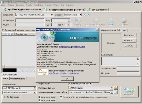 Лучший аудио риппер из своего рода программ. Программа копирует аудио треки с аудио-CD на жесткий диск конвертируя в 3G2, 3GP, MP1, MP2, MP3, Windows Media Audio, Ogg Vorbis, MP4, M4A, AAC, aacPlus v1 (HE-AAC, AAC+), aacPlus v2 (HE-AAC v2, HE-AAC+PS, eAAC+), FLAC, Musepack, WavPack, WAV, AIFF, Monkey's Audio, Shorten, CUE and M3U. Also, the Nero Digital (Nero AAC). В программе встроен плеер с поддержкой ID3 и ID3V2 тегов. Так же можно конвертировать поддерживаемые форматы между собой. В программе присутствует ряд фильтров для повышения качества звучания. В программе доступно 30 языков. Одна из основных черт - это возможность использования как стандартных Windows ACM-драйверов, так внешних или внутренних кодеков (Wave/PCM, Wave/ADPCM, LAME MP3 Encoder, TwinVQ VQF Encoder, Fraunhofer MP3 Encoder, Windows Media Audio Encoder). Поддерживается загрузка данных о диске из CDDB, использование и р